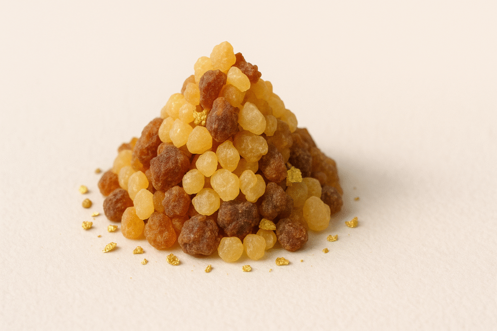 Substancje rytualne i luksusowe Mirra – żywica o głębokim, balsamicznym zapachu, znana od tysięcy lat ze swoich właściwości oczyszczających, regenerujących i uziemiających zarówno dla ciała, jak i ducha.Kadzidłowiec – złocista żywica o delikatnym, cytrusowo-drzewnym aromacie, wspierająca medytację, oddech i wewnętrzne wyciszenie, jednocześnie działająca odmładzająco na skórę.Złoto – symbol czystości i światła, stosowane w kosmetyce dla nadania blasku, pobudzenia mikrocyrkulacji oraz jako element energetyczny wzmacniający wibrację luksusu i harmonii.