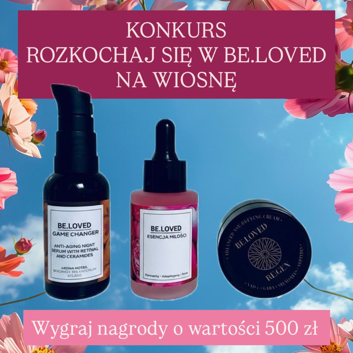 Nagrodą w konkursie są 3 kosmetyki marki Be.Loved o łącznej wartości 500 zł: Game Changer, Esencja Miłości oraz RE:GEN krem (NAD+).